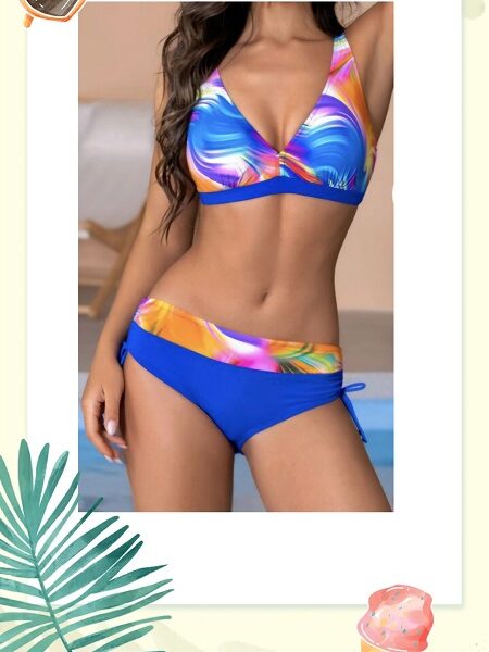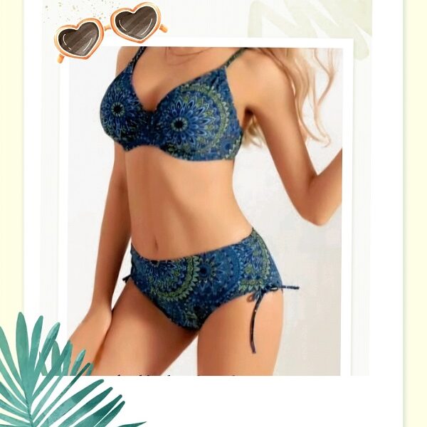 costume due pezzi. slip con laccetti laterali per regolare l’altezza del fianco,reggiseno a canotta con coppette estraibili, chiusura a gancio.